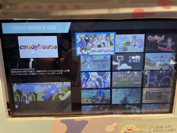 月1で個人ゲーム開発者を集まって、お互いのゲームを見せ合ったり意見交換が行われる「東京インディーズ」のブースを発見!ゲーム筐体風のパッケージが凄く可愛かったです。色々なタイトルが遊べて、多くの来場者が足を止めていました。ゲームを選択することができる…それってめちゃくちゃ贅沢な体験だなと個人的に感じました。