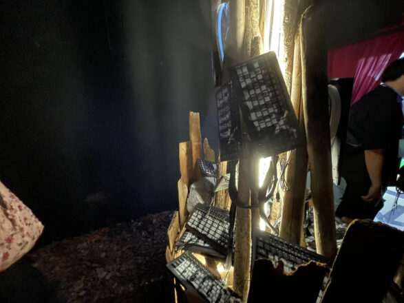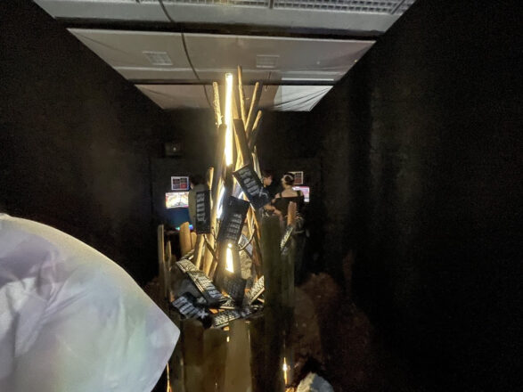 会場の人込みをかわしつつ、目の前に飛び込んできたのは何となく隔離された怪しい建物と顔ハメフォトスポット…そしてその中には…これまた怪しいキーボードのモニュメントが作られており、床にはウッドチップが敷き詰められている異空間が作られていました。