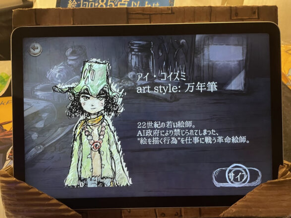 この日の試遊で使われていたのは株式会社ワコムの最新ポータブルクリエイティブパッド「Wacom MovinkPad 11」で、軽くて物凄く描きやすいし、書いている時の触感とかこれまで体験したことのないようなレベルのものを使わせていただき感動しつつ…描いた絵がコレです。このクオリティーでもAIさんがしっかり優しく包み込んでくれる。これが「愛」ですね。