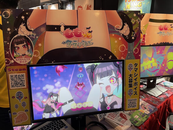 『ももっとクラッシュ』は、ふとももで魂を挟んで浄化するリズムアクションゲームです。プレイヤーはふとももを操作して流れてくる魂を挟んで浄化したり、ウイルスを弾いてみたり、猫をのせてみたり…混沌の世界で唯一無二の浄化の力を持つ「太もも戦士」を操り、多くの魂を救うべく、自身も含め沢山の来場者が浄化プレイを楽しんでいました。